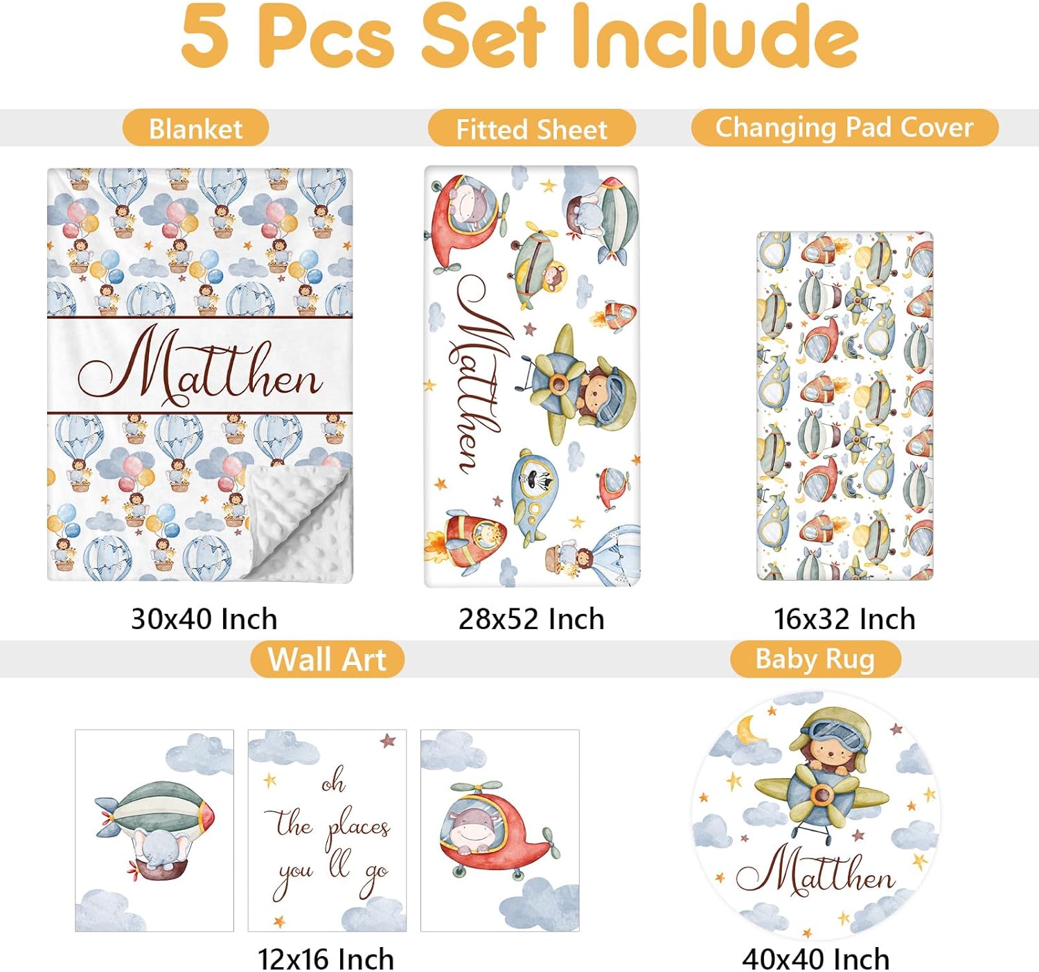 Personalized Crib Bedding Set, 5 Pcs Custom Name Nursery Bedding Set with Double Layer Flannel Blanket, Pilot Animals Baby Crib Set for Boys Girls, Customized Gifts for Toddlers Infants Babies