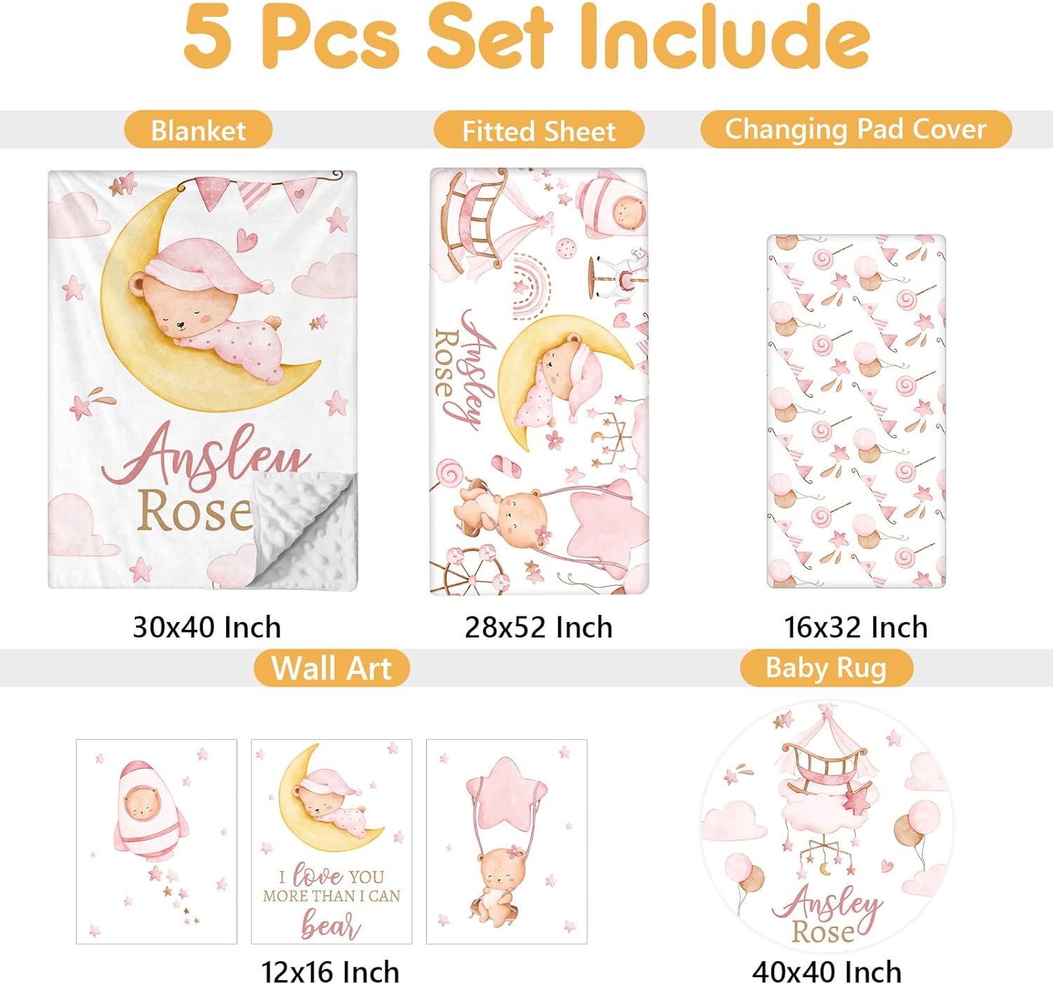 Custom Crib Bedding Set, 5 Pcs Customized Baby Crib Set with Name, Soft Double Layer Nursery Baby Bedding Set for Girls Boys, Personalized for Infants Toddlers, Pink Moon Bear