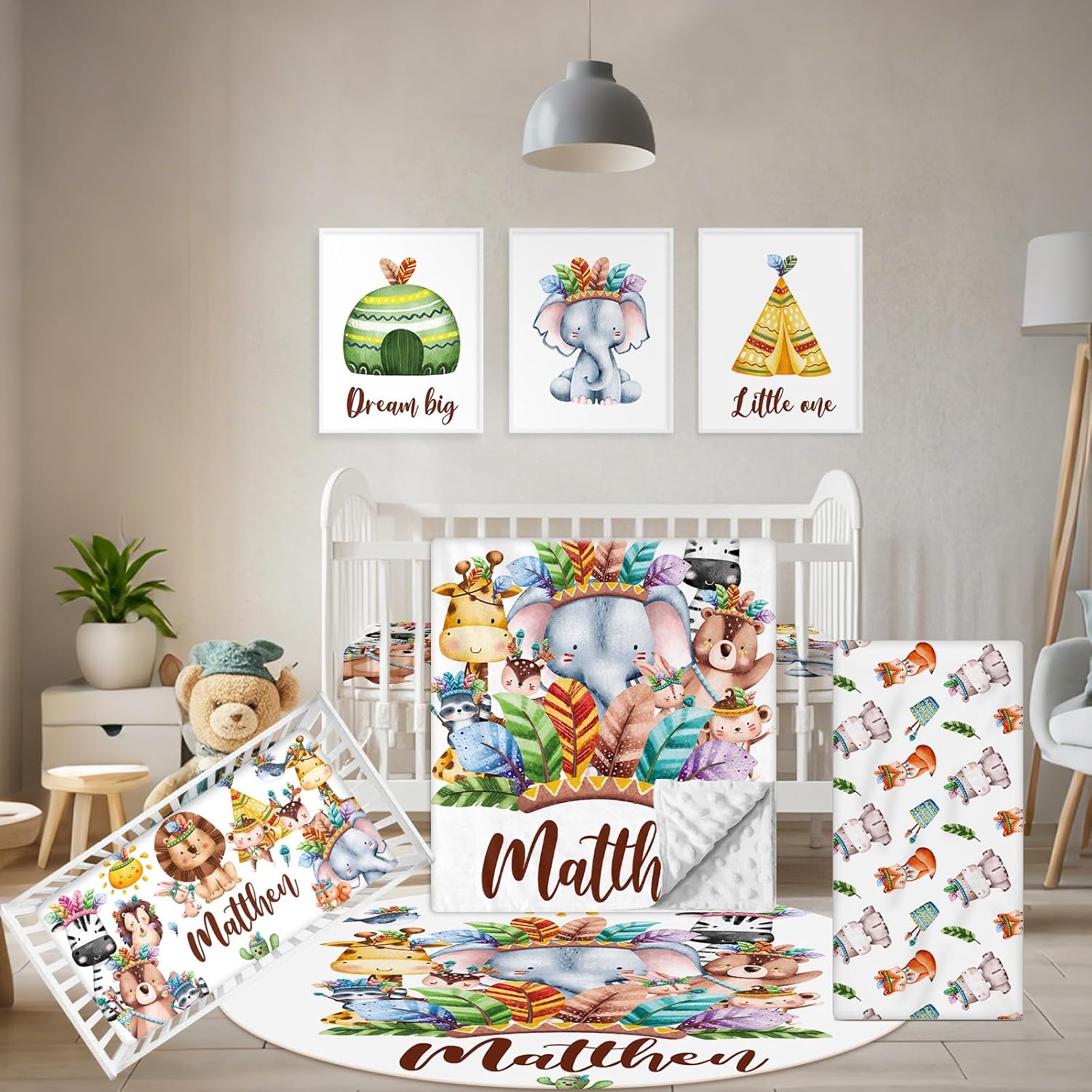 - Complete Set: This customized baby bedding set includes a double layer dotted backing blanket, crib sheet, changing pad cover, baby rug and wall arts, designed to add style and comfort to your nursery. The dotted backing of the double-layer blanket will be adored by your little one.