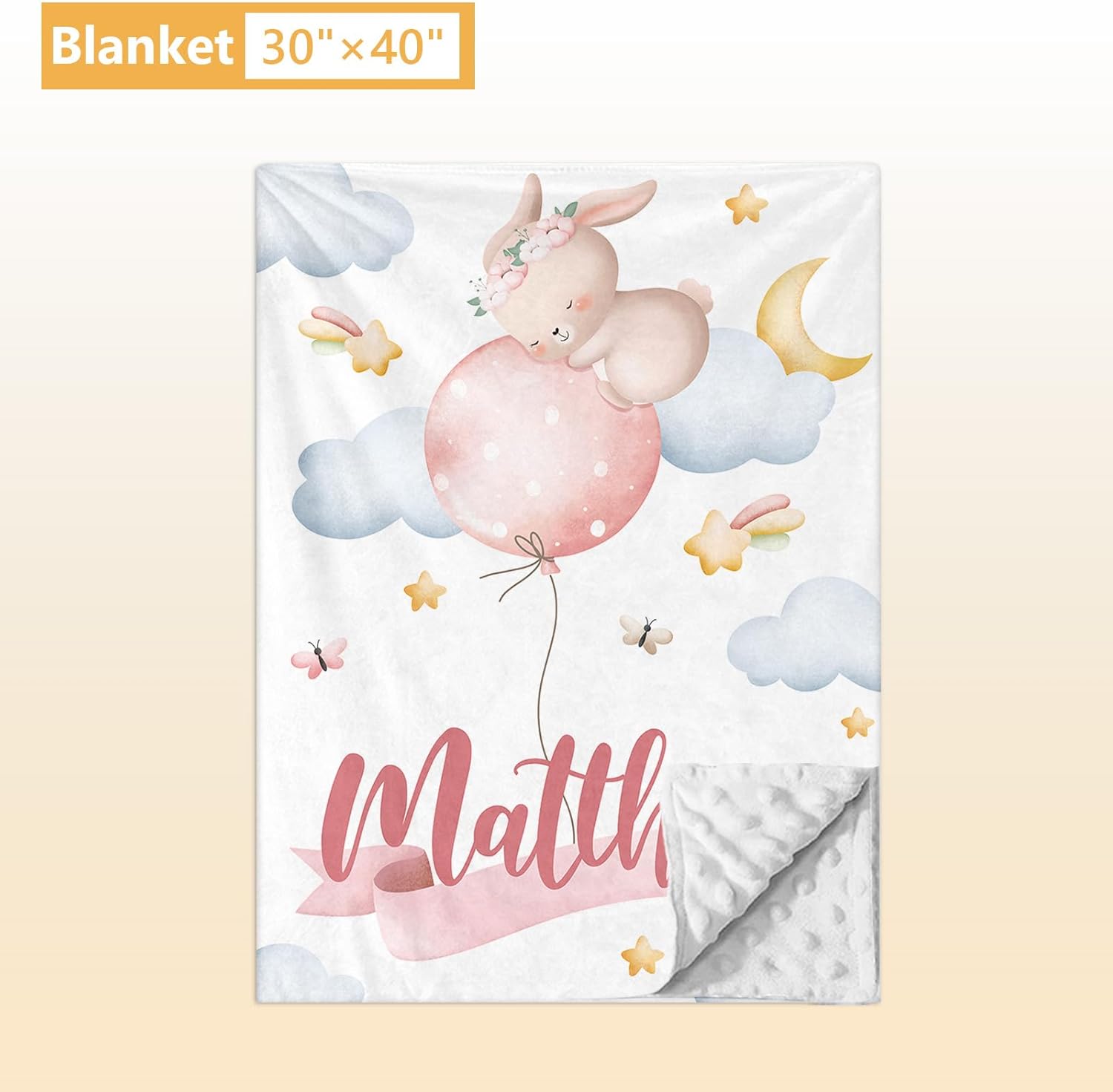 Personalized Baby Crib Bedding Set, 5 Pcs Custom Name Baby Crib Set with Double Layer Blanket, Soft Balloon Bunny Nursery Bedding Set for Girls Boys, Customized Gifts for Infants Toddlers