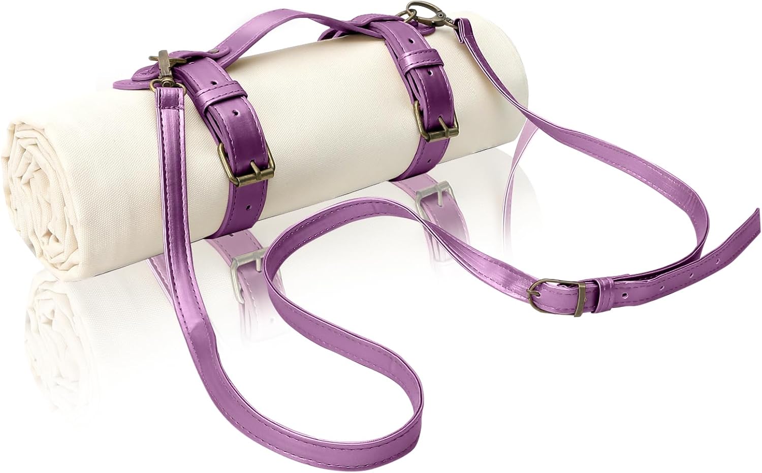 - Includes: 1 white canvas mat, faux leather handle/should strap, and webbing strap