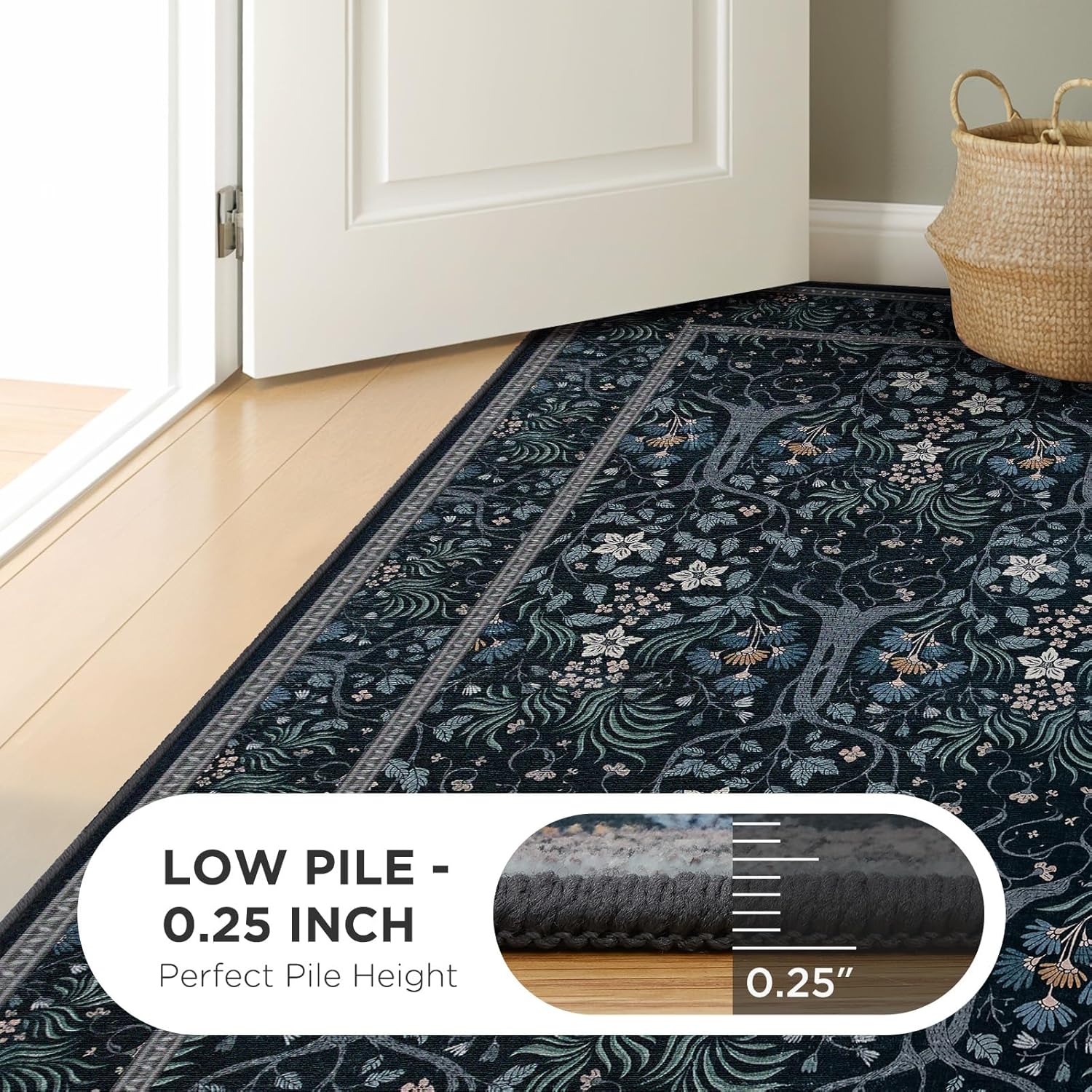 Joydeco Floral Living Room Rugs, Washable Large Bedroom Rug 8x10 Under Bed Non Slip, Soft Forest Botanical Low-Pile Floor Indoor Throw Carpet for Dining Table Home Office, Blue-Black