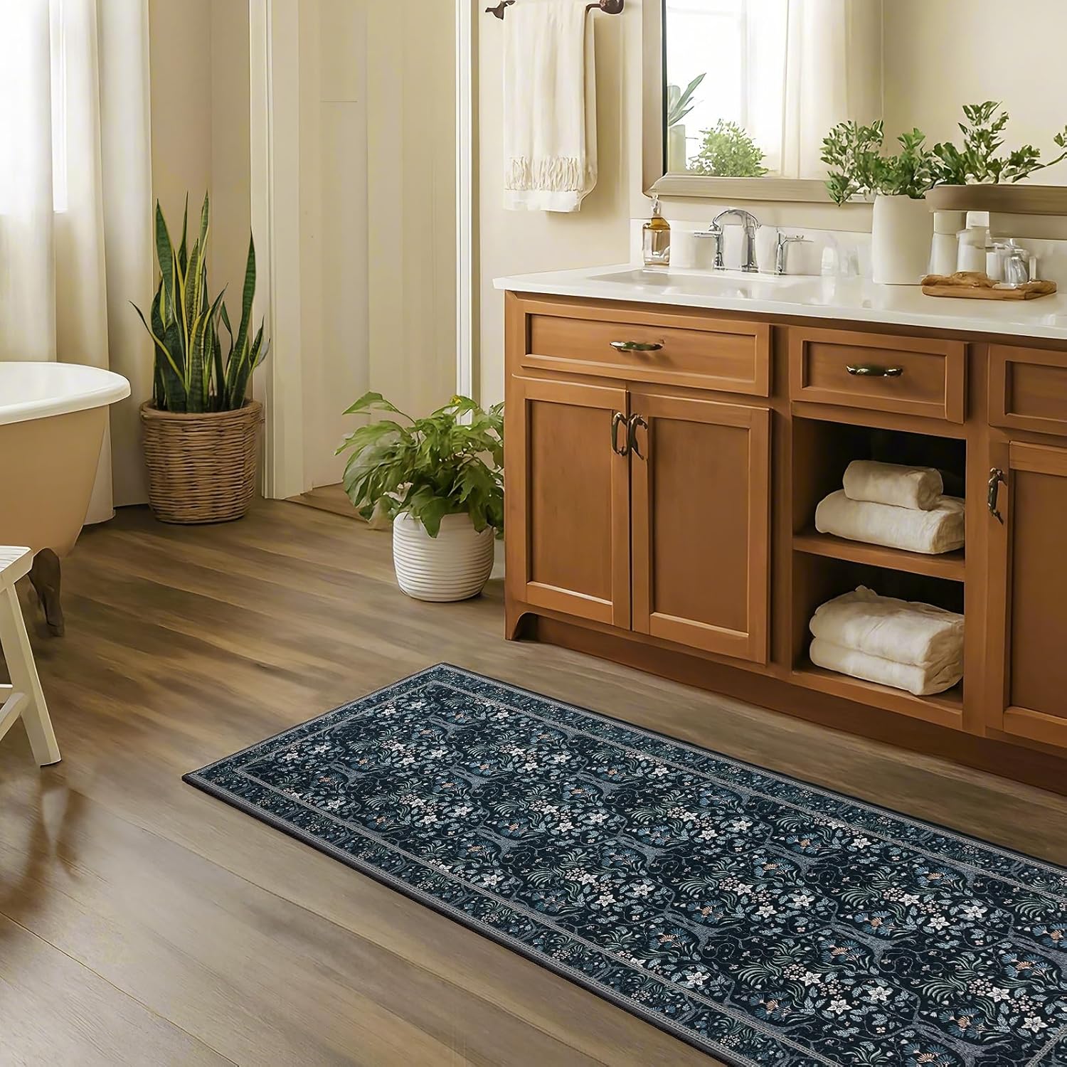 Joydeco Floral Washable Runner Rug for Kitchen, Forest Hallway Rug Runner 2x6 Non Slip, Boho Botanical Ultra-Thin Soft Indoor Floor Throw Carpet for Bathroom Entryway Foyer, Blue-Black