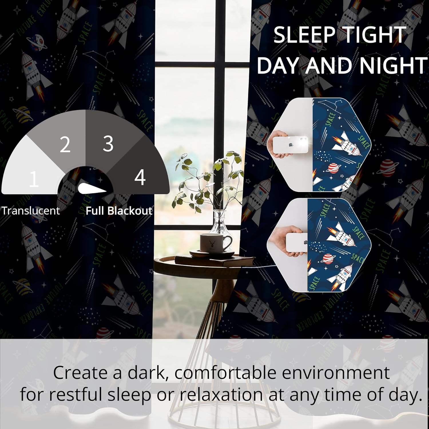 Kids Space Rocket Blackout Curtains - 100% Blackout, Thermal Insulated, Noise Reducing, Perfect for Kids Room and Nursery, 2 Panels (Future Explorer Rockets, W52×L84)