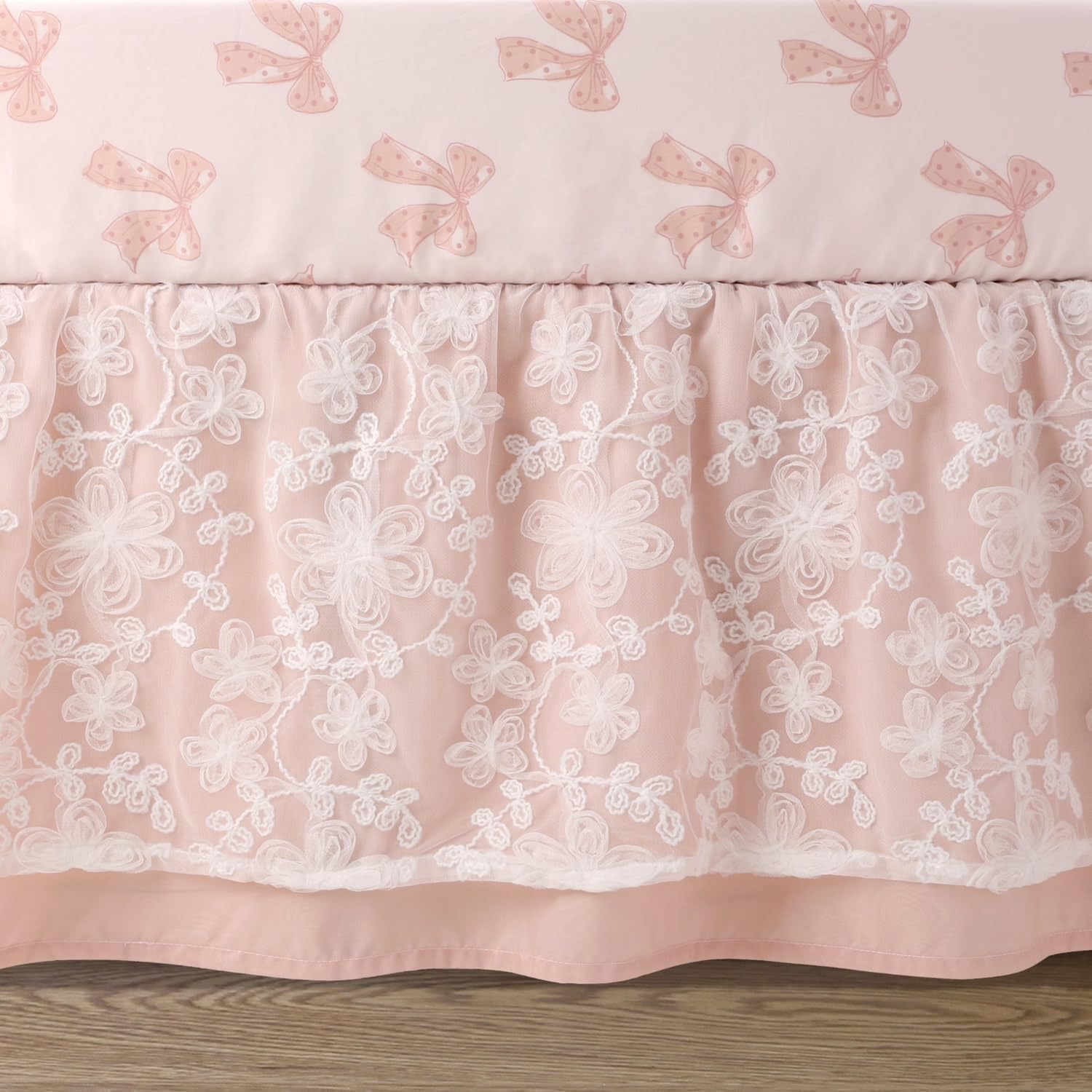 - Complete Baby Crib Set for Girls: Elegant patchwork quilt has a unique feel with embroidered dot, moire taffeta, crinkle satin and overlay with a ribbon textured floral pattern, breathable fitted cotton crib sheet, 4-sided, long layered crib skirt