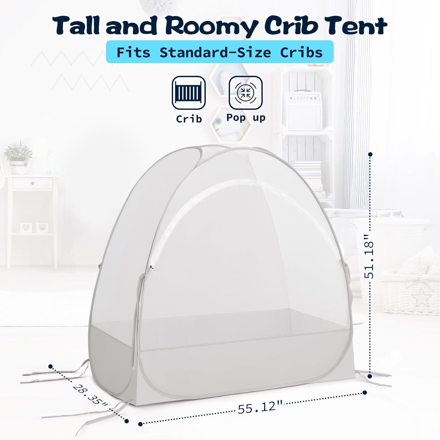 - Easy To Install: Just need to open the package, remove the fixed rope, the baby crib tent will automatically pop-up, fixed on the bed with the rope to the mini crib tent. The large opening of the crib tents for toddlers allows you to easily put the mattress and baby into the crib, so that you can finish the installation and use it in a few minutes.