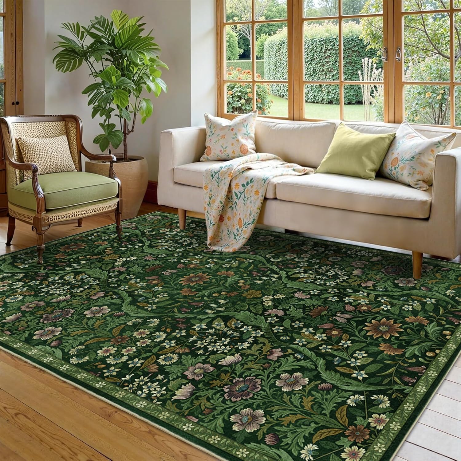 Floral Washable 6x9 Area Rug,Dark Green Boho Rugs for Living Room, Soft Low-Pile Non-Slip Stain Resistant & Non-Shedding Carpet for Bedroom, Dining Room, Office, Entryway, Nursery