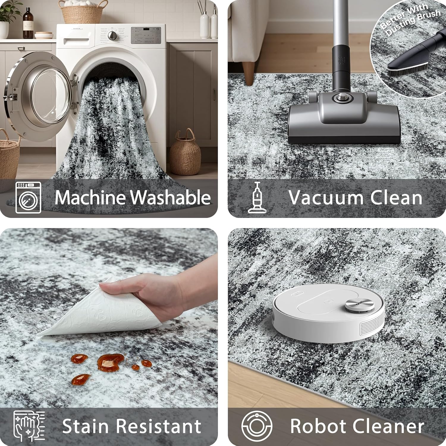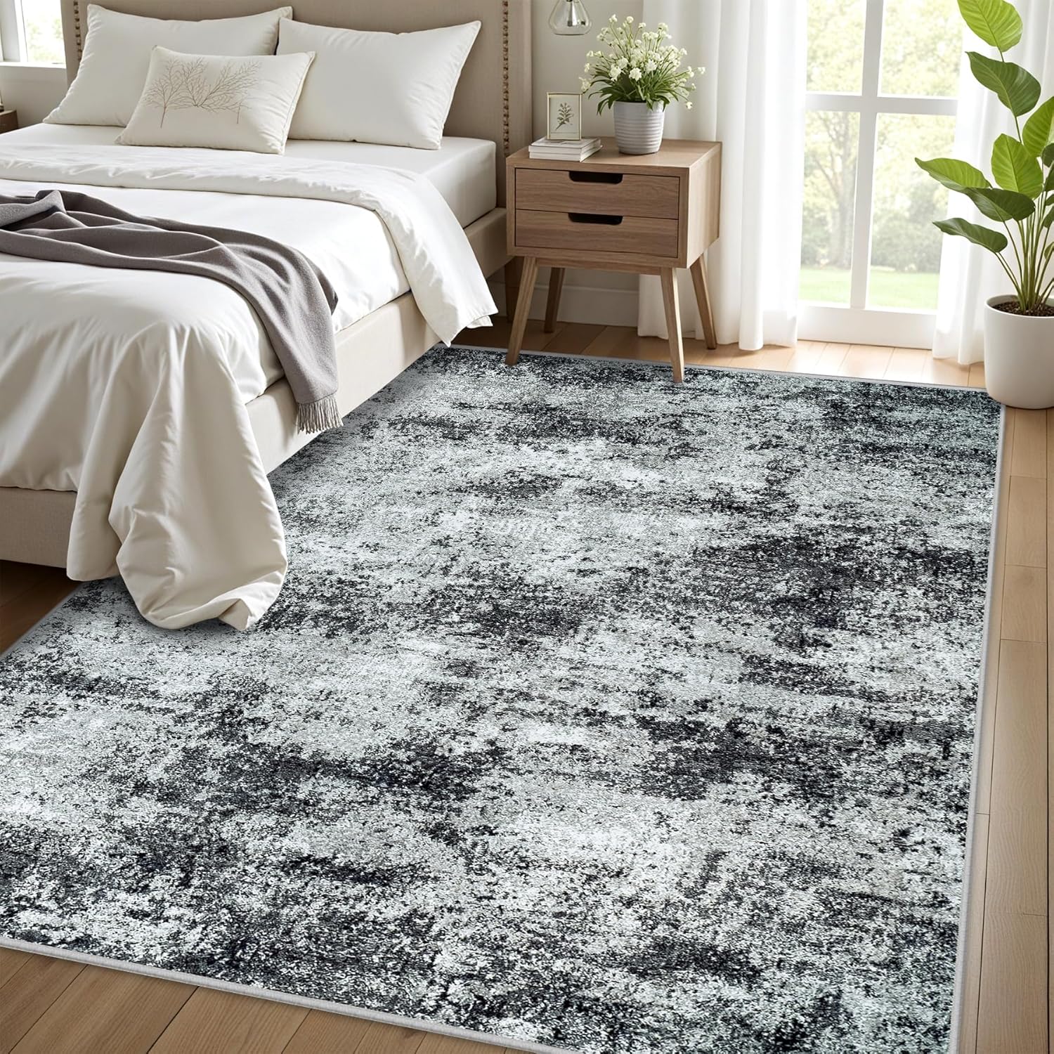 Washable Rug 6x9 Area Rugs: Abstract Washable Rugs with Non-Slip Backing, Stain Resistant Indoor Floor Carpet for Bedroom Dining Room Table Nursery Hallway Home Office Dark Black/Gray