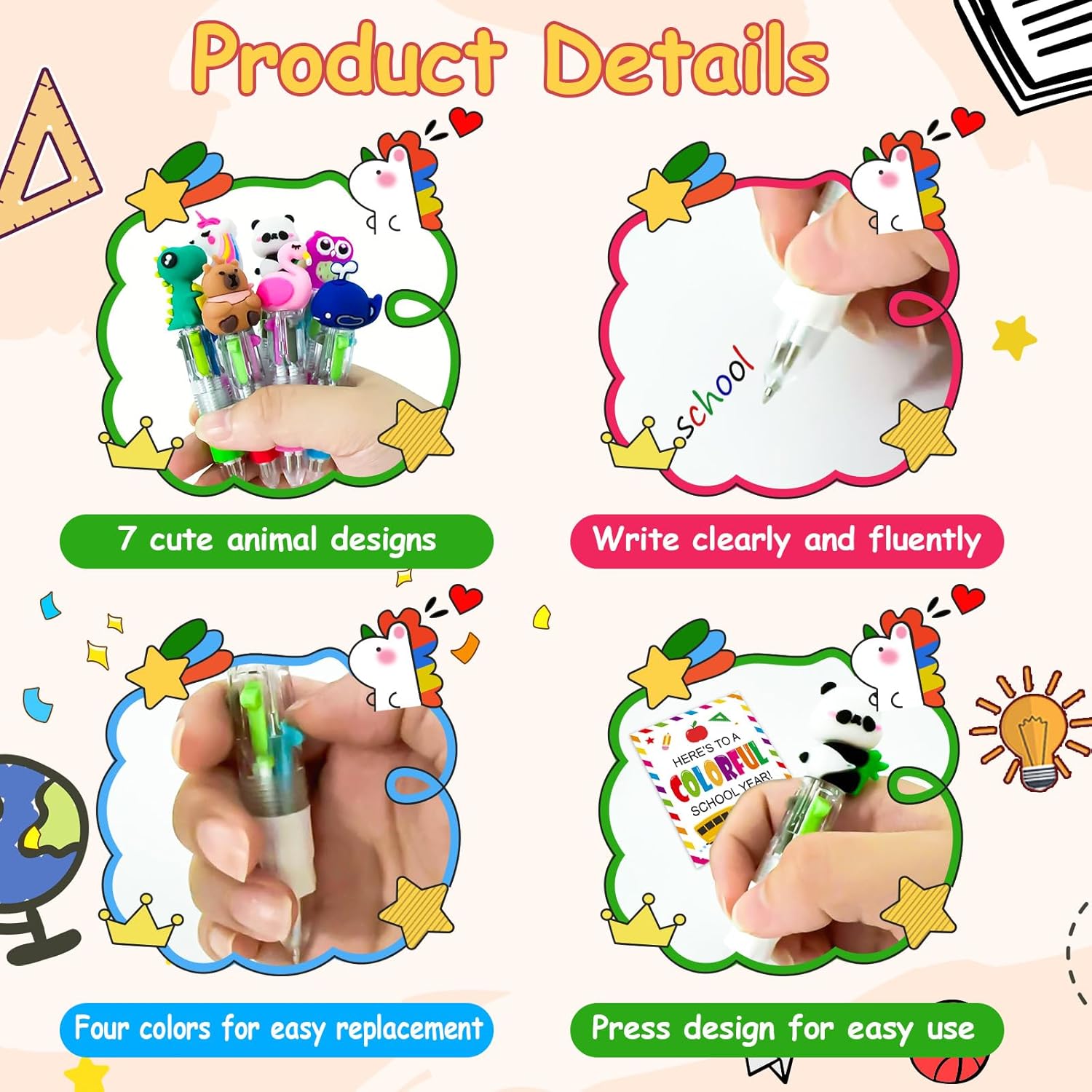 - COMPLETE SET: Totally 84 pieces set include 28 colorful 4-in-1 retractable ballpoint pens with adorable cartoon animal toppers, 28 matching gift cards and 28 gift bags.