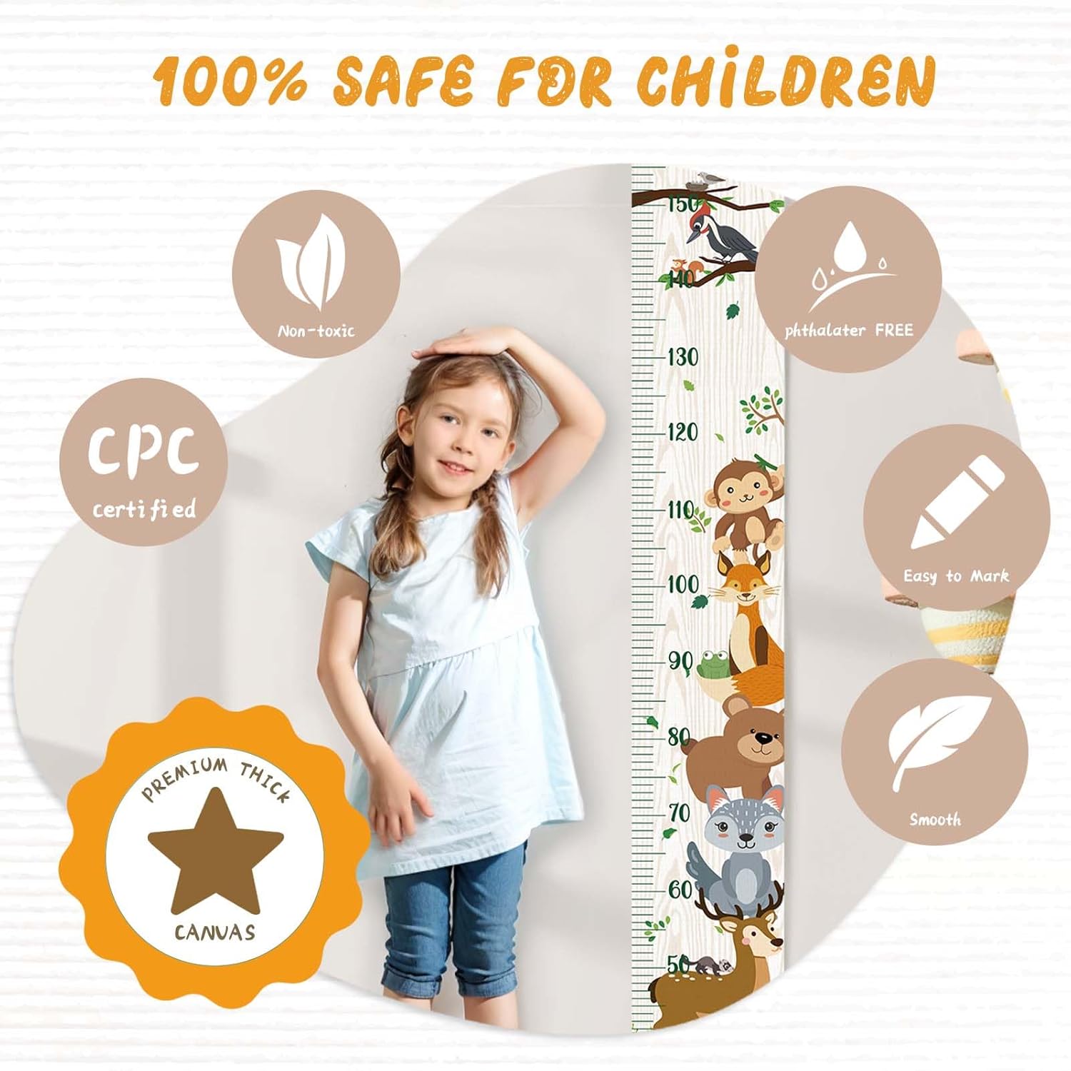 - Canvas Height Chart: Crafted from top-grade, thick, resilient, and waterproof canvas encased in a wooden frame, our kids growth chart for wall guarantees unmatched quality. They are safe, lightweight, foldable, and waterproof.