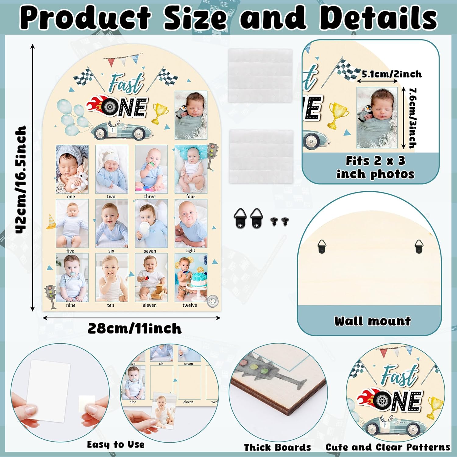 - First-Year Picture Display: Our race car themed wooden photo board is good for capturing baby's first year growth, which is measuring approximately 11 Ă— 16.5 inches, with 12 spots for 3 Ă— 2 inch photos. This fast one birthday decoration creates a joyful visual timeline of your baby boy's special moments. Display it in the nursery or at a baby shower, making every memory last a lifetime.
