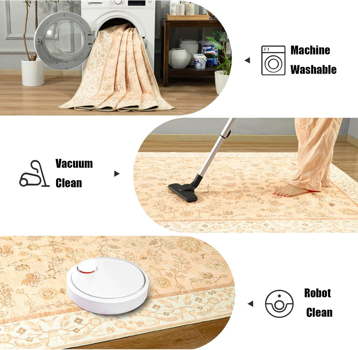 - Tips: Due to vacuum packaging, folded carpet for living room may have small creases when they arrive. Walk around and tread on them, they will disappear within a few days. When vacuuming, use a soft roller cleaner head and ensure the vacuum is on the lowest setting. Machine washable but do not use bleach. With proper care, your boho rug will remain beautiful for a long time.