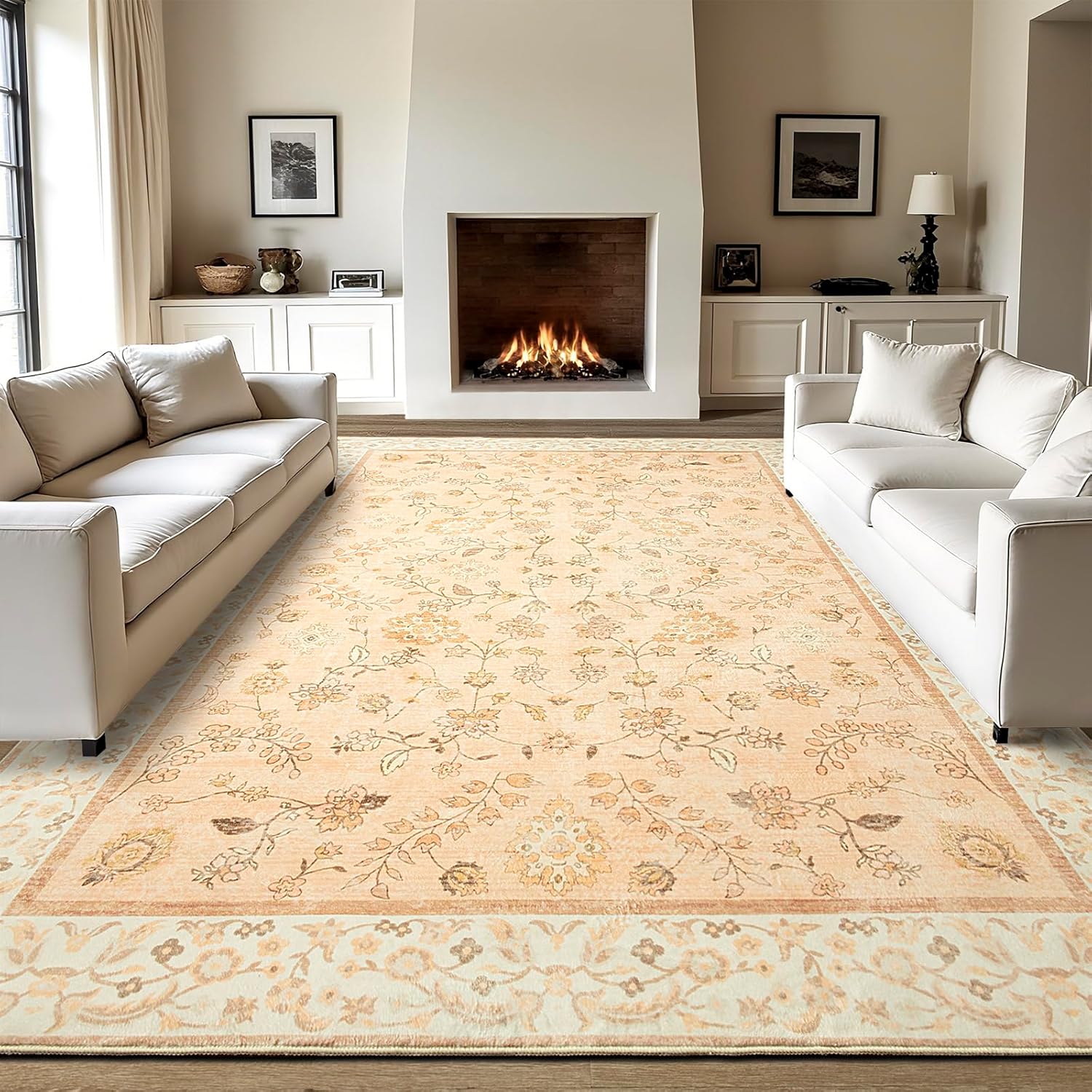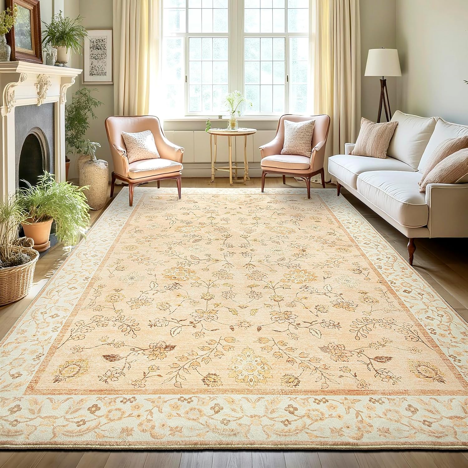 LOCHAS Washable Area Rugs 6x9, Peach Floral Rug for Living Room Bedroom Non Slip, Ultra Soft Vintage Indoor Carpet for Kids, Nursery, Dorm, Dining Room, Classroom, Boho Flower Home Decor, Low-Pile