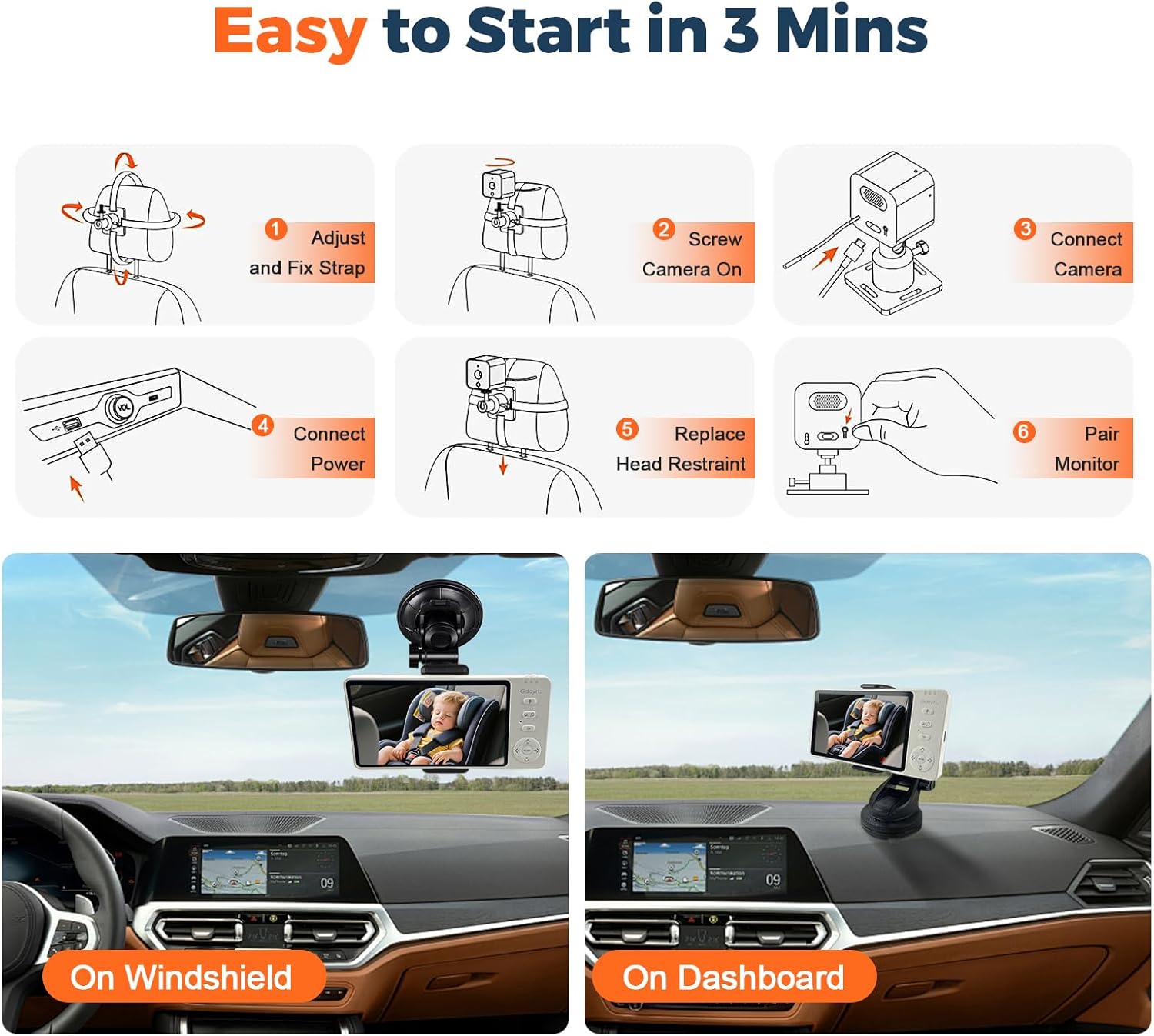 - [Smart Anti-Glare Display] IPS HD screen,Two-Way Intercom.1080P glare-resistant screen adapts to sunlight with 6-level brightness/volume adjustment. Built-in voice intercom enables front-backseat communication. 3500mAh battery supports 7hr wireless monitoring. Multi-angle mount fits dashboards/windshields.