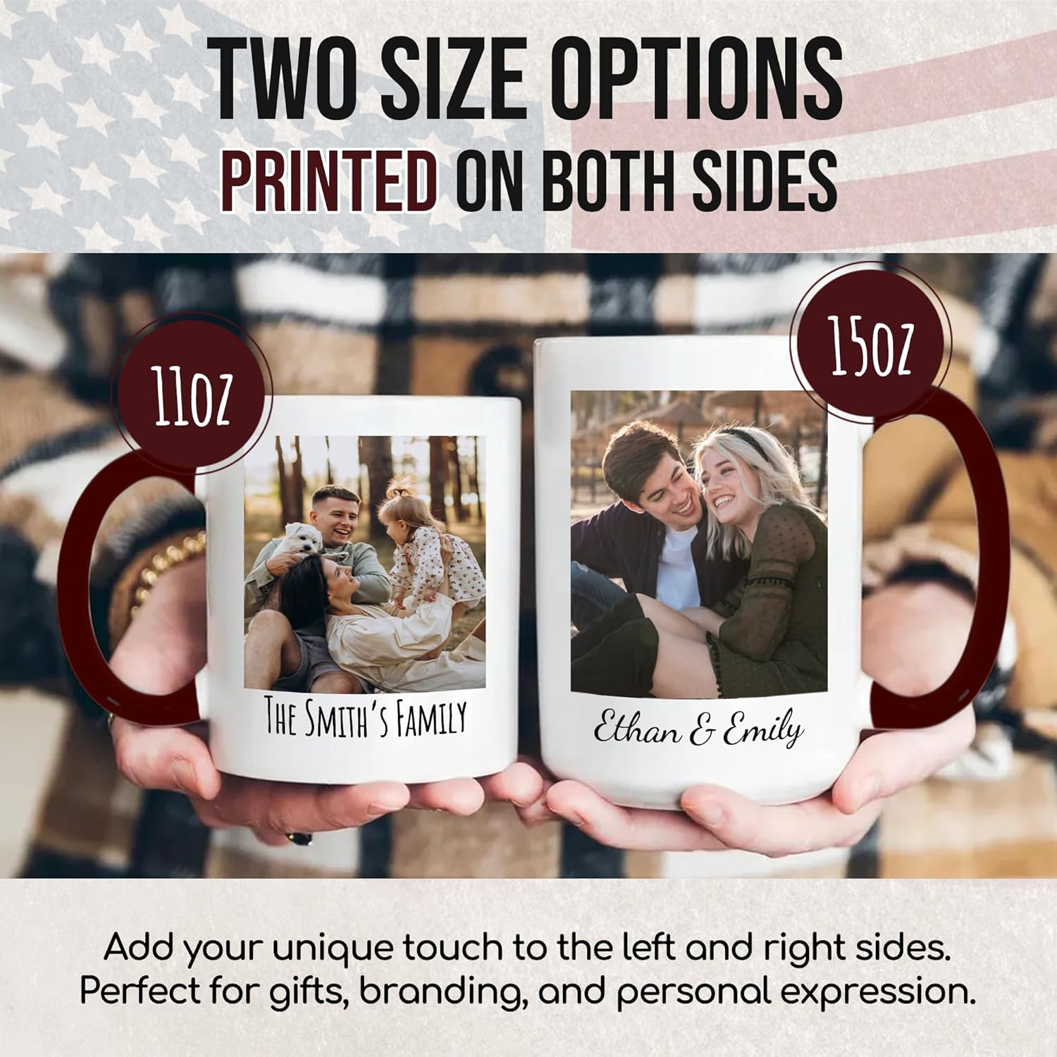 - Custom Coffee Mugs Made in the USA - Made with care and quality by skilled artisans. Personalize your coffee mug with a photo, logo or text. Both sides of the mug can be individually designed, allowing you to express your unique creativity through personalization.