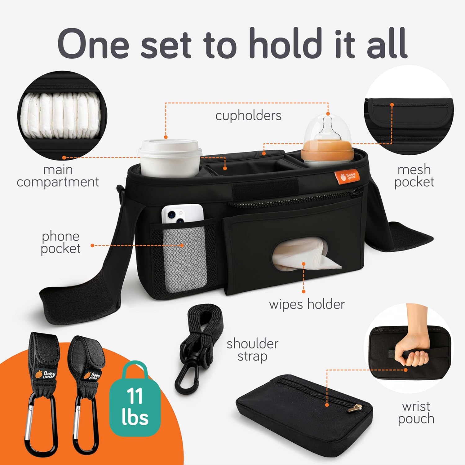 - One set to hold it all: A roomy baby stroller organizer (main compartment, 2 insulated XL cupholders, phone pocket, wipes dispenser, zip-off wrist bag + mesh pocket) and 2 stroller hooks for bags weighing up to 11 lbs keep all your baby accessories right at your fingertips.