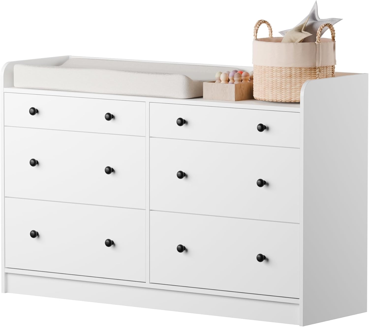 Cozy Castle Baby Dresser with 6 Drawers and Large Table Top, Multi-Functional Chest of Drawer, Drawer Dresser with Three-Sided High Rails for Nursery, Children's Room, Bedroom, White