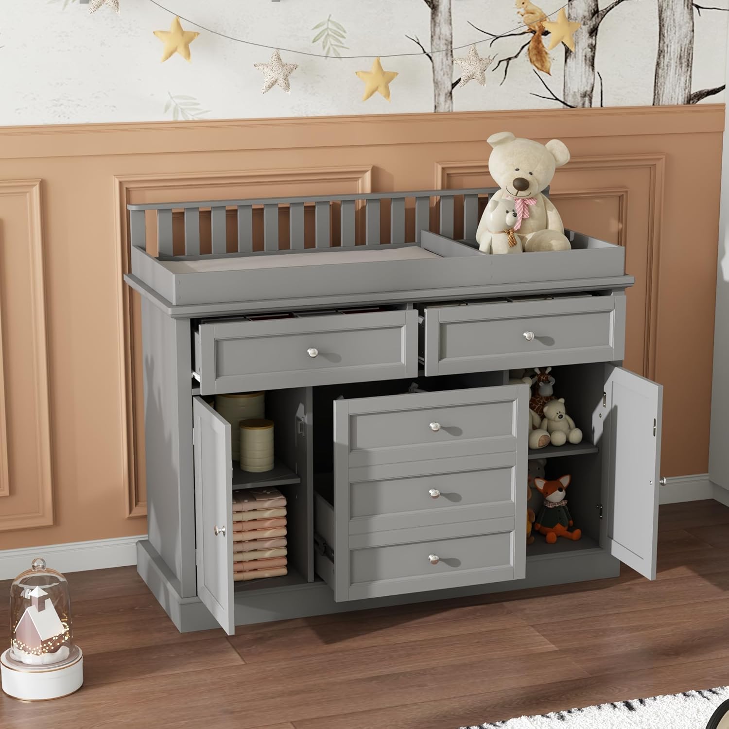 - Various-scene Use - ROMESHINE grey nursery dresser adopts a simly clean design, can perfectly match different home schemes and tones. This integrated storage cabinet has added more practical storage solutions, including a sliding laundry hamper, it allows you to get rid of dirty clothes faster when changing your baby's clothes, or make diaper access easier.