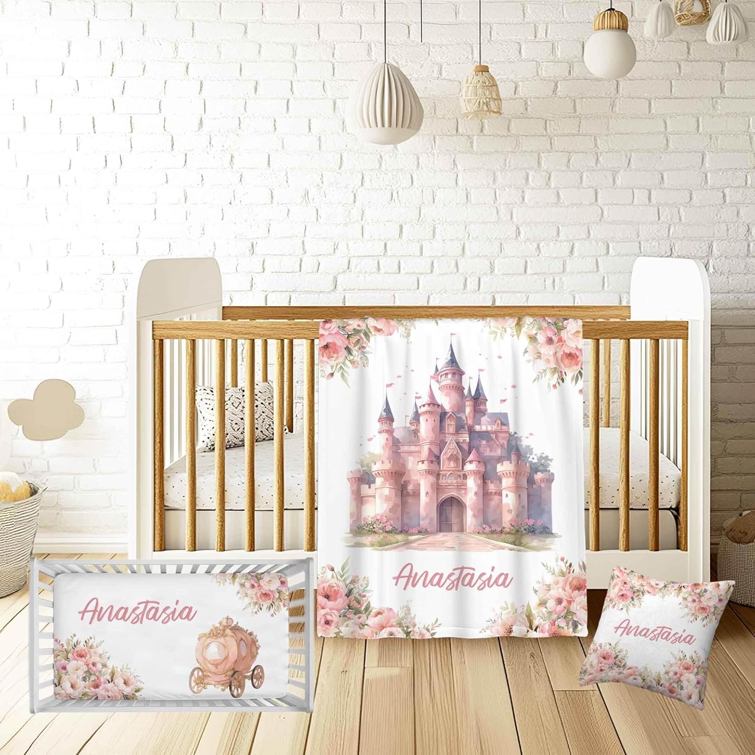 Personalized Baby Girl Crib Bedding Set – Custom Name Princess Castle 3-Piece Nursery Set with Soft Flannel Blanket, Fitted Sheet & Pillowcase – Infant & Toddler Bedding Gift