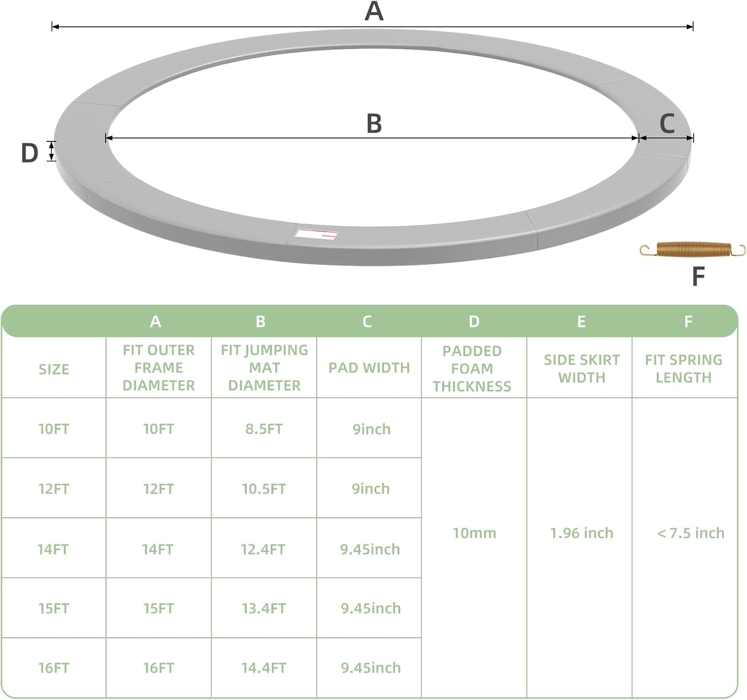 - 【Rich Configuration】Our trampoline mats come in four colors: blue, black, purple, and gray, and five sizes: 10ft, 12ft, 14ft, 15ft, and 16ft, to meet the needs of most trampolines.