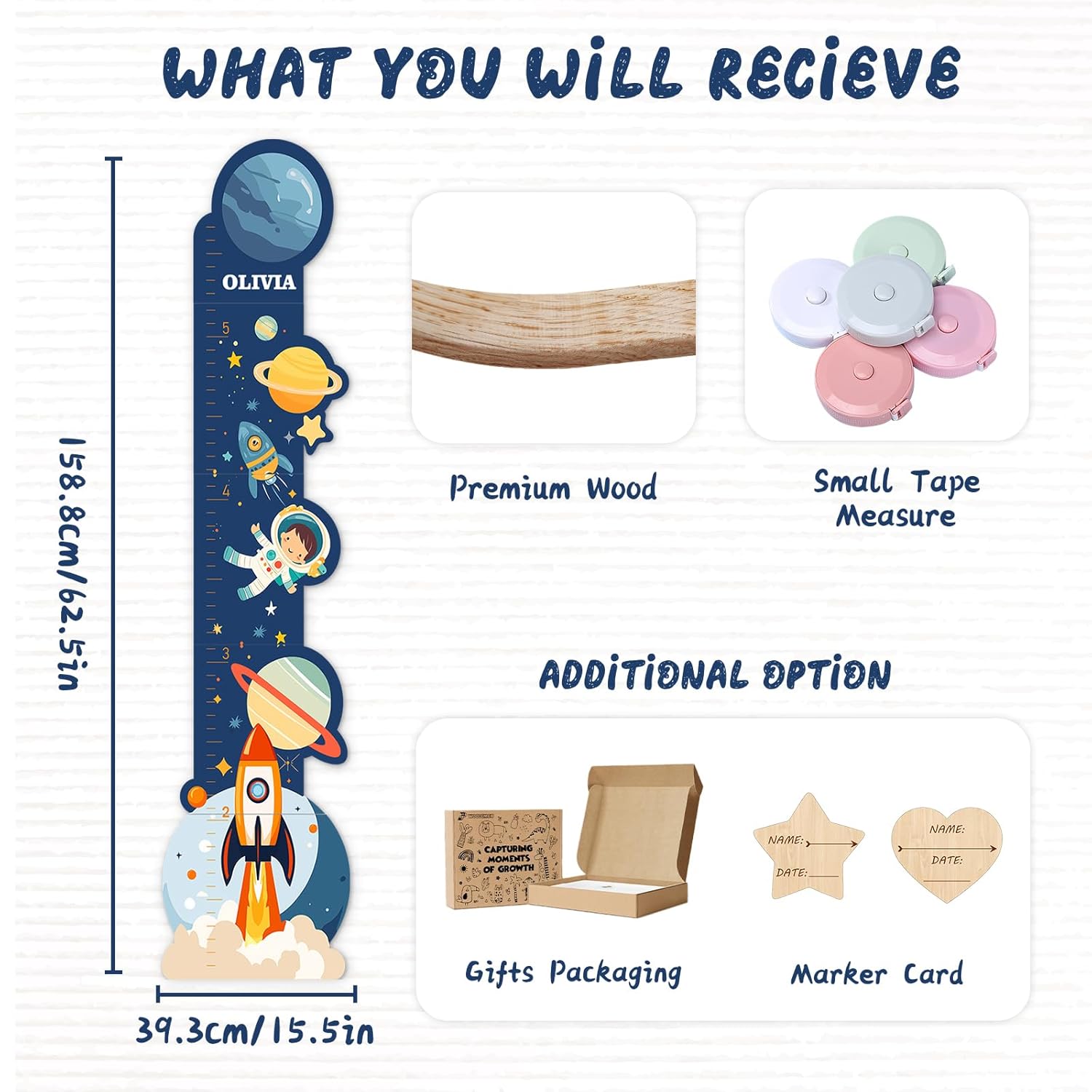 Personalized Name Wooden Growth Chart Wall Decor – Kids' Space Height Measurement Chart for Baby, Boys & Girls Room 62.5" x 15.5"